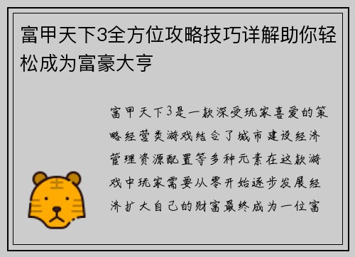 富甲天下3全方位攻略技巧详解助你轻松成为富豪大亨